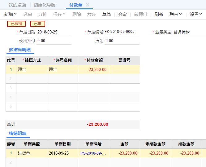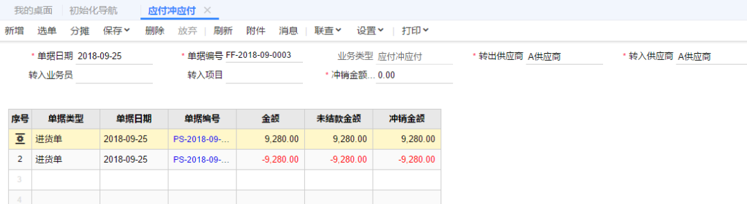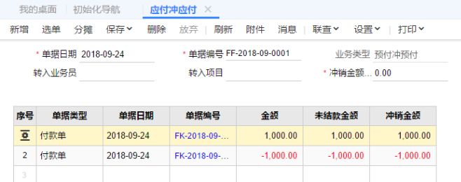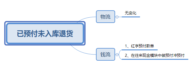 钱流:之前支付给供应商时已经做了一笔预付款单,预付款退回时,需要再做一笔预付款单,录入负数金额,并在往来现金模块中点击【应付冲应付】菜单,业务类型选择【预付冲预付】,选择两笔红蓝预付款单冲销。