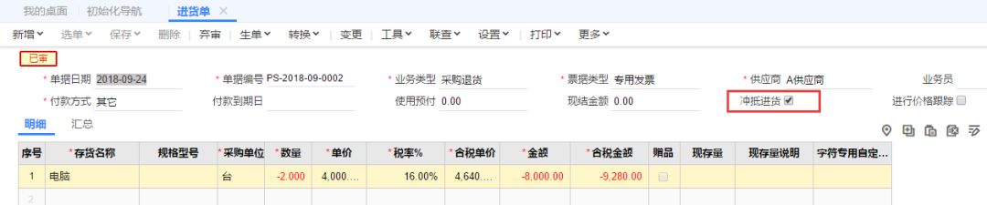 物流:已入库的存货退货后需要生成红字采购入库单,减少库存数量。