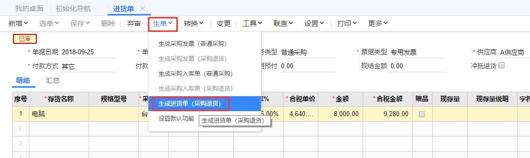 1. 若先做进货单,流转生成采购入库单,那么退货时,由进货单生成红字进货单,再生成红字采购入库单;