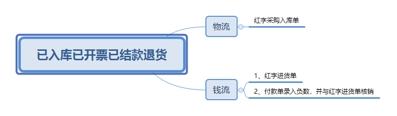 钱流:由于已经结款,通过之前的进货单生成红字的进货单,并做付款单录入负数进行核销,调整已付往来账款。