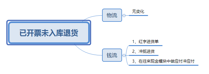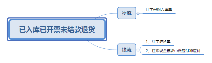 钱流:由于未结款,通过之前的进货单生成红字的进货单,并在往来现金模块中做应付冲应付,冲抵往来应付账款。