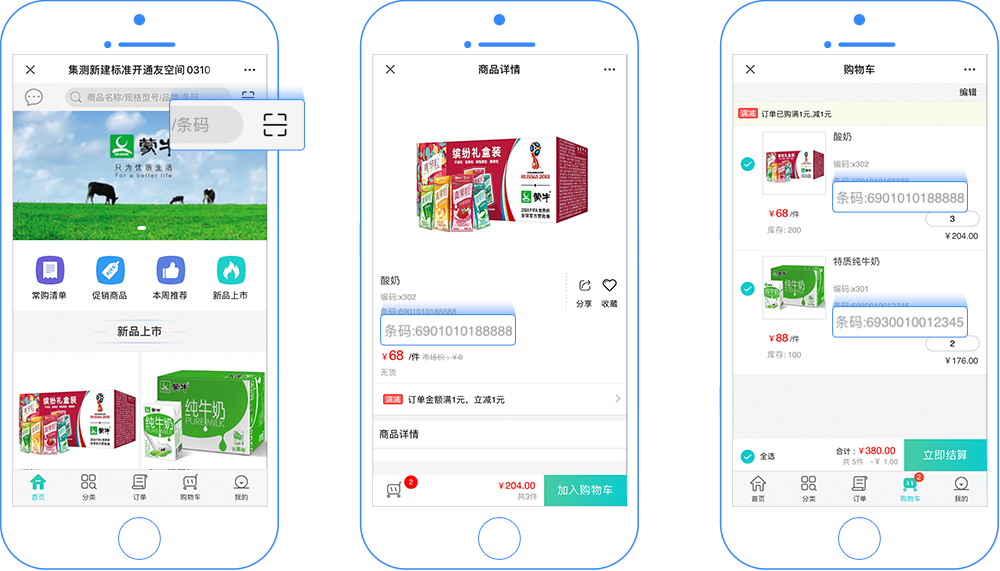 订货客户,在商城中通过录入条码搜索商品或通过扫码搜索商品,快速定位到商品,提高了下单效率。