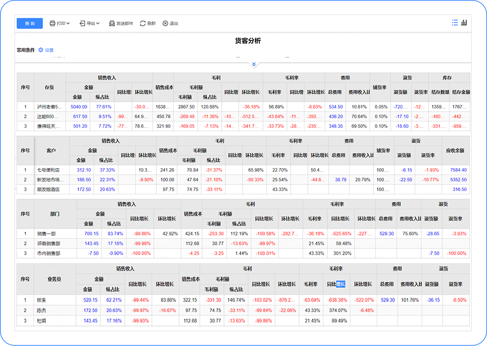 部门,业务员,商品,客户,客户分类等多个维度查询综合业绩贡献情况,方便企业做优劣评比判定。